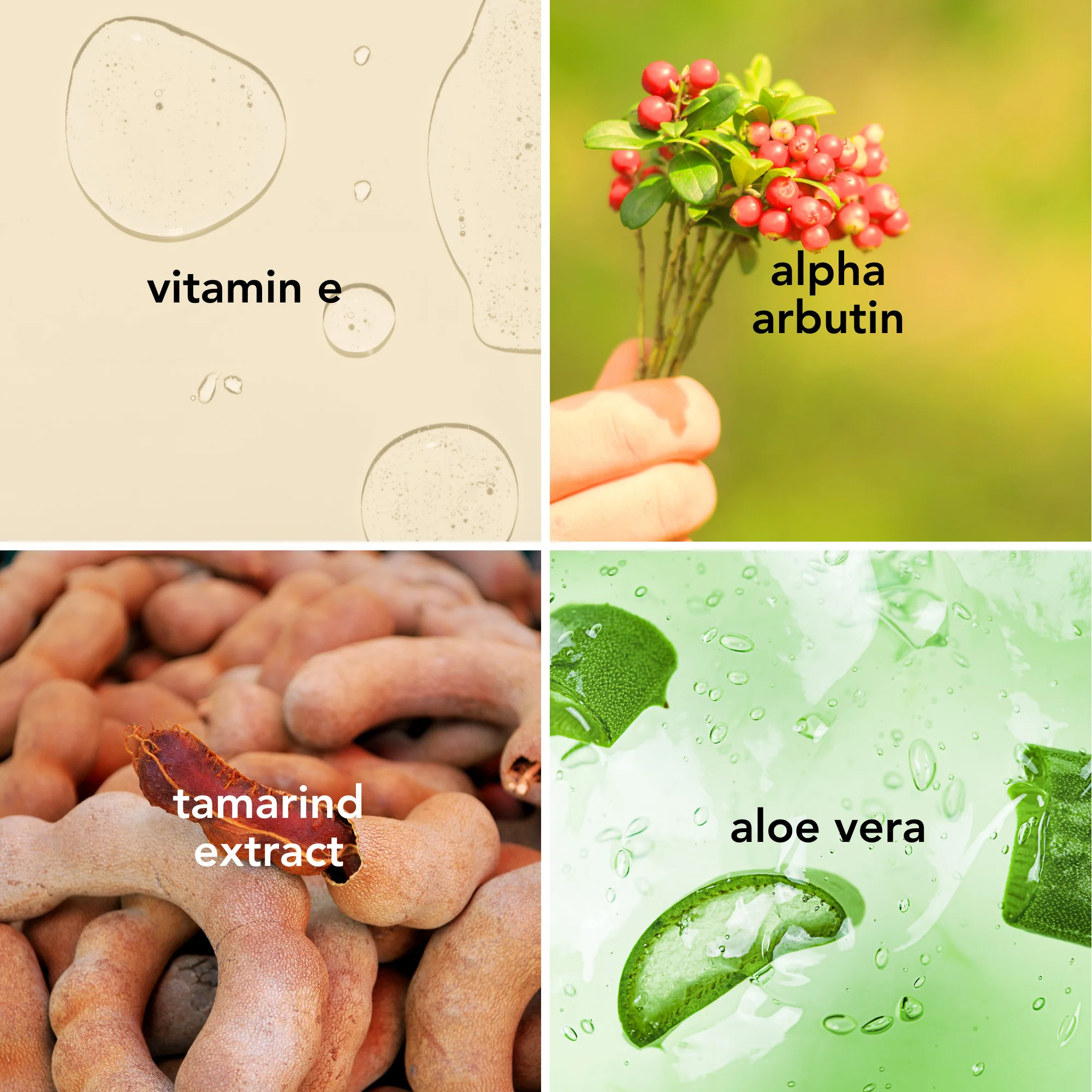 Alpha Arbutin, Fruity Tamarind Extract, Aloe Vera, Vitamin E